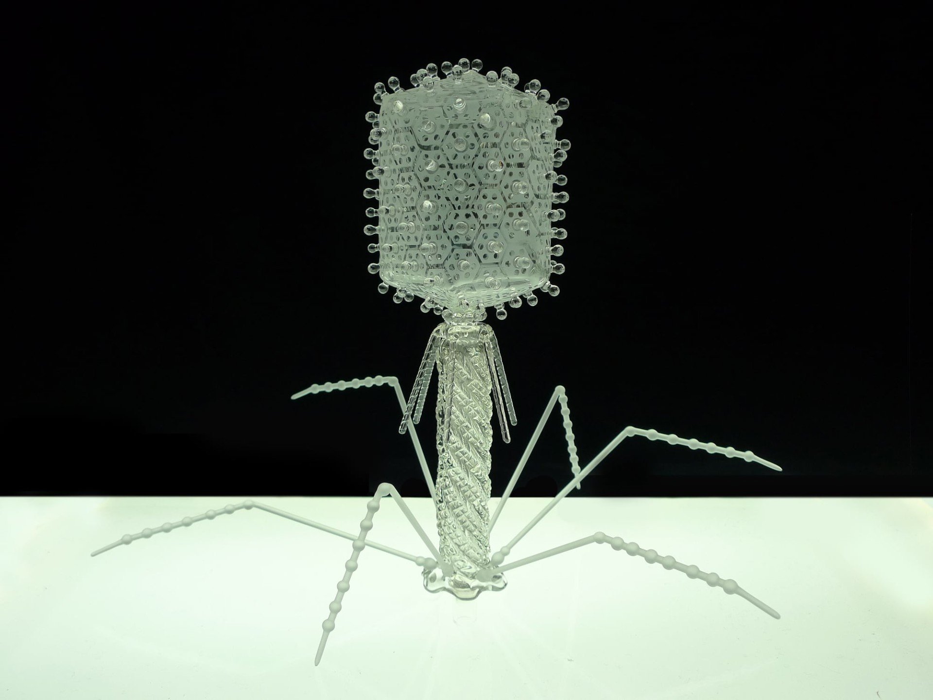 I microorganismi sono ritratti in grande scala (nel caso del coronavirus la scultura è quasi 2milioni di volte più grande dell’originale). Ma lucide e trasparenti le installazioni non appaiono monumentali. La trasparenza del materiale, poi, accresce la precisione scientifica dell’oggetto, che ha al centro fili di acido nucleico.