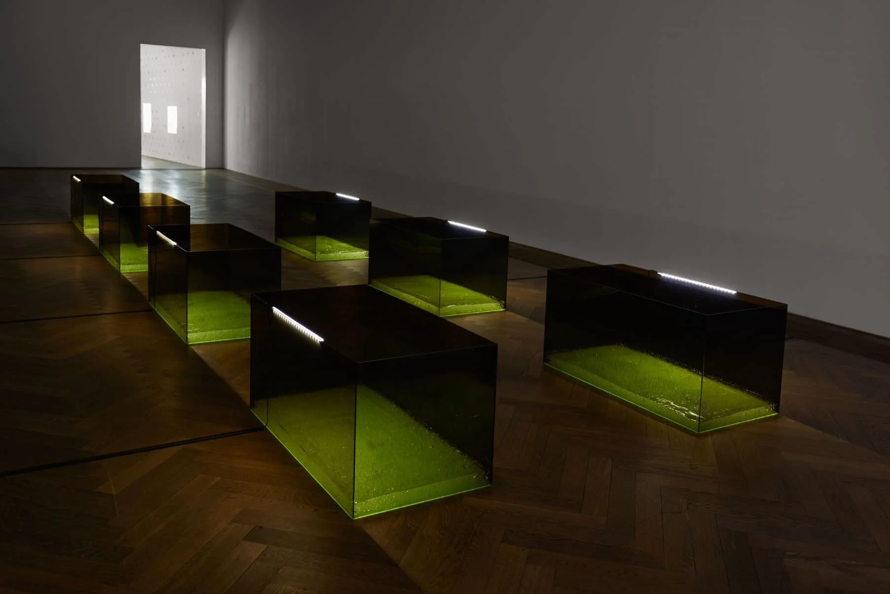 Anicka Yi Shameplex, 2015 Plexiglass, spilli placcati in nichel, gel per ultrasuoni, strisce LED, 7 scatole 60.96 × 121.92 × 60.96 cm ciascuna Veduta dell’installazione, Kunsthalle Basel, Basilea, 2015 Courtesy l’artista, Gladstone Gallery, New York e Bruxelles, e 47 Canal, New York Foto Phillip Hänger/Kunsthalle Basel