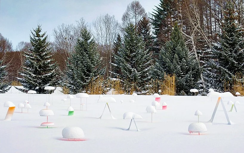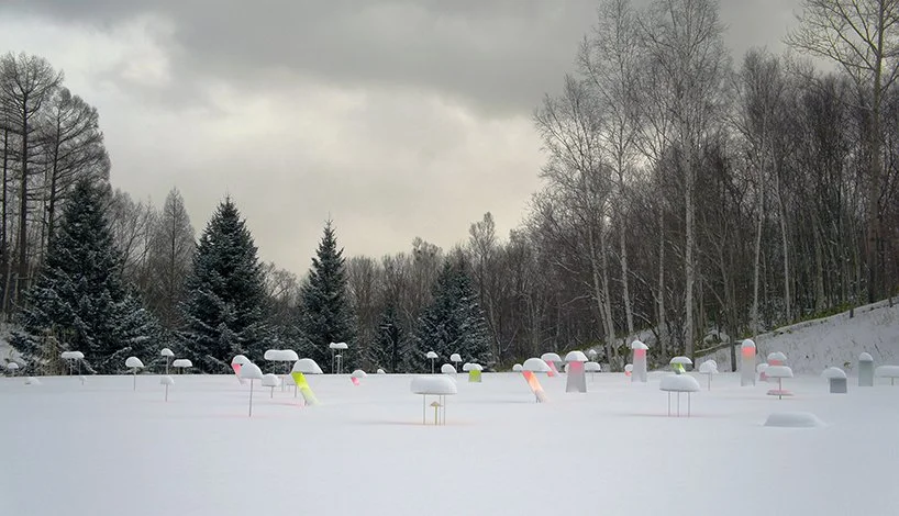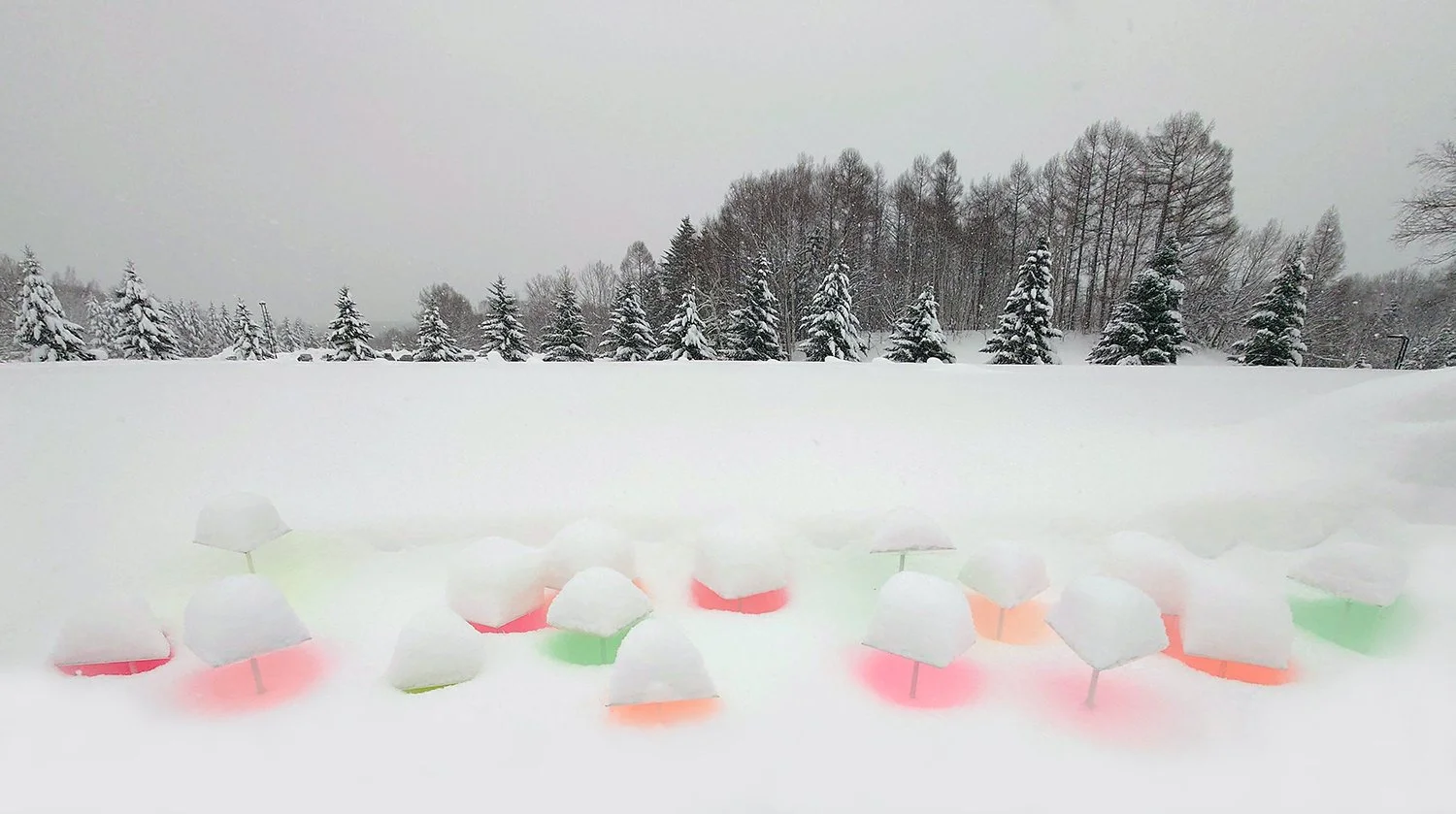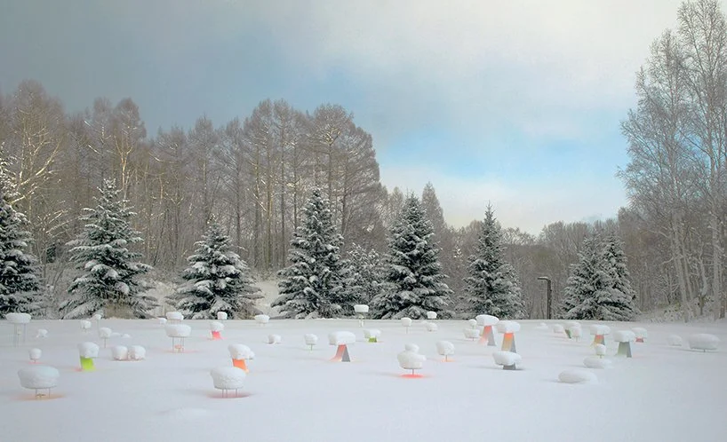 Certo, niente a confronto con le monumentali nevicate di Sapporo, appena 65 chilometri più a nord: “A Sapporo City sono caduti 55 cm di neve in 24 ore, tra l’11 e il 12 gennaio, battendo il record dall'inizio delle statistiche.” Questa è la città in cui l’artista vive e dove ha posizionato Snow Pallet 15. Sessantacinque elementi dalle forme più disparate che si estendono su un’area vastissima e compongono un mosaico scultoreo in continuo cambiamento (a seconda dell’ora del giorno, della luce, della stagione) che si staglia ai margini della foresta e ne onora la silenziosa grandezza.