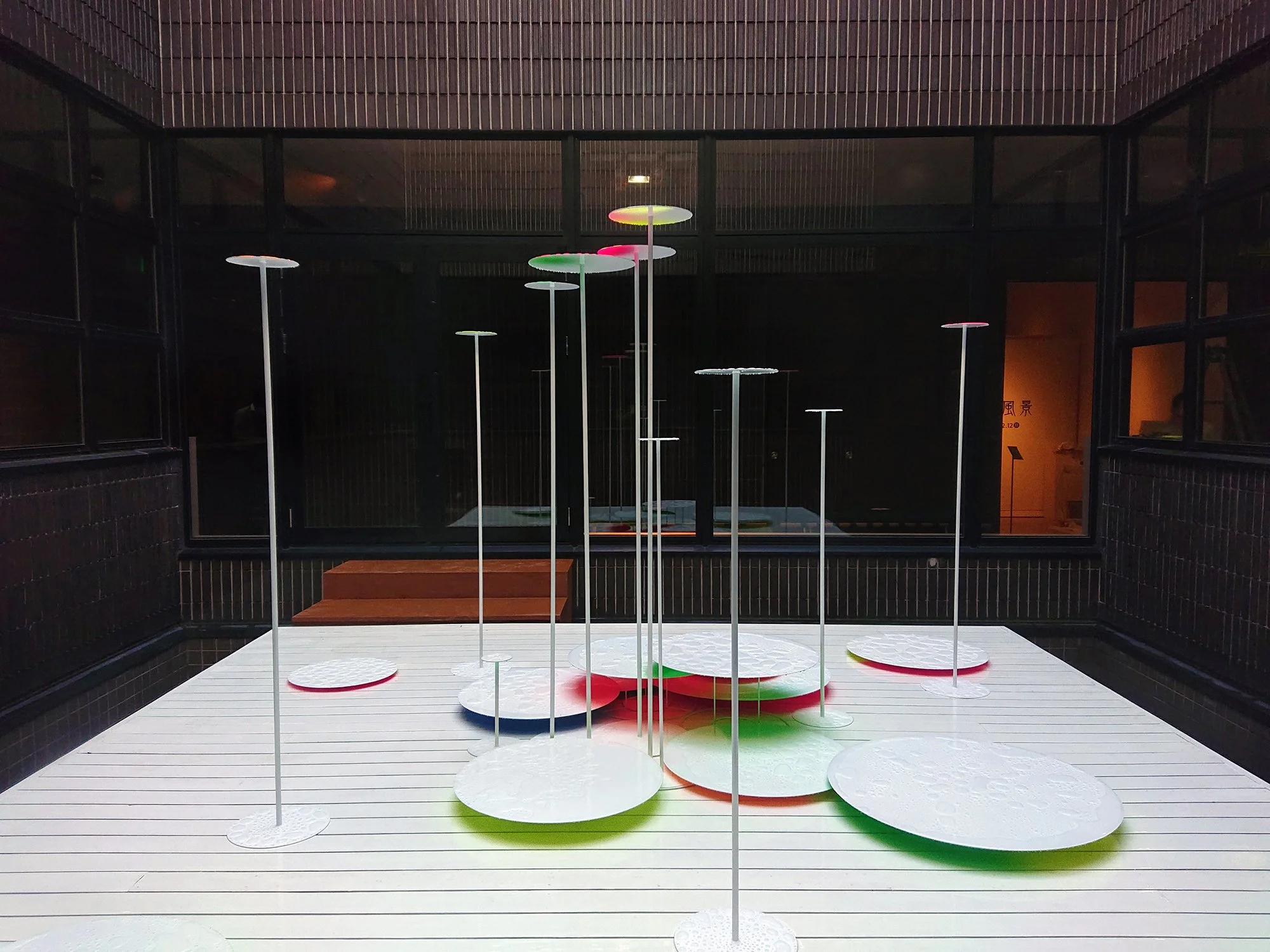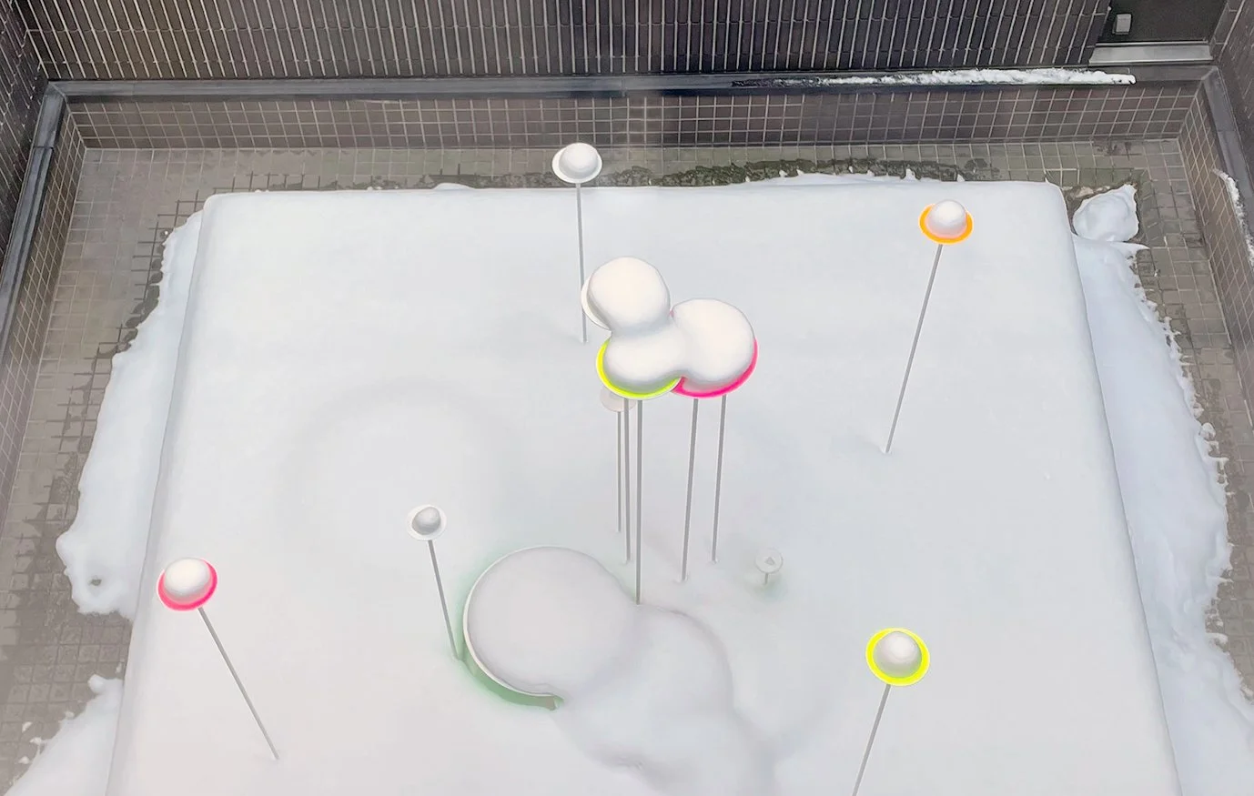 “Snow Pallet 14 si svolge nell'area con meno nevicate di tutta Hokkaido- prosegue- È il sito più piccolo in cui ho mai lavorato. La sua area è solo di circa 19 metri quadri”. L’installazione è composta da sculture piatte, circolari, in alcuni casi ampie, che fanno pensare a foglie di ninfea stilizzatissime, e altre alte svettanti come piante di un canneto cresciute nel mezzo di uno stagno. Intorno, le pareti in legno del Tomakomai City Museum incorniciano con grazia l’opera, che per l’occasione è stata dipinta con i soliti toni pastello intensissimi sulla sommità degli elementi più alti, anziché sotto. “Quando guardi il cielo, puoi vedere il colore espandersi. Inoltre, nei giorni di pioggia, sembra che le gocce danzino scivolando dai colori vivaci dei piatti superiori. Ho chiamato questi oggetti Rainy Pallets”. Shibuya questa volta si aspettava di giocare con i riflessi prodotti dall’acqua o al massimo con una spolverata di neve pronta a sciogliersi all’arrivo del vento salmastro. Invece, inaspettatamente, anche sull’Oceano Pacifico, quest’anno ad Hokkaido ha nevicato molto: “Il 5 gennaio 2022 sono stati accumulati oltre 30 cm di neve. Si tratta di un record per questa regione”.