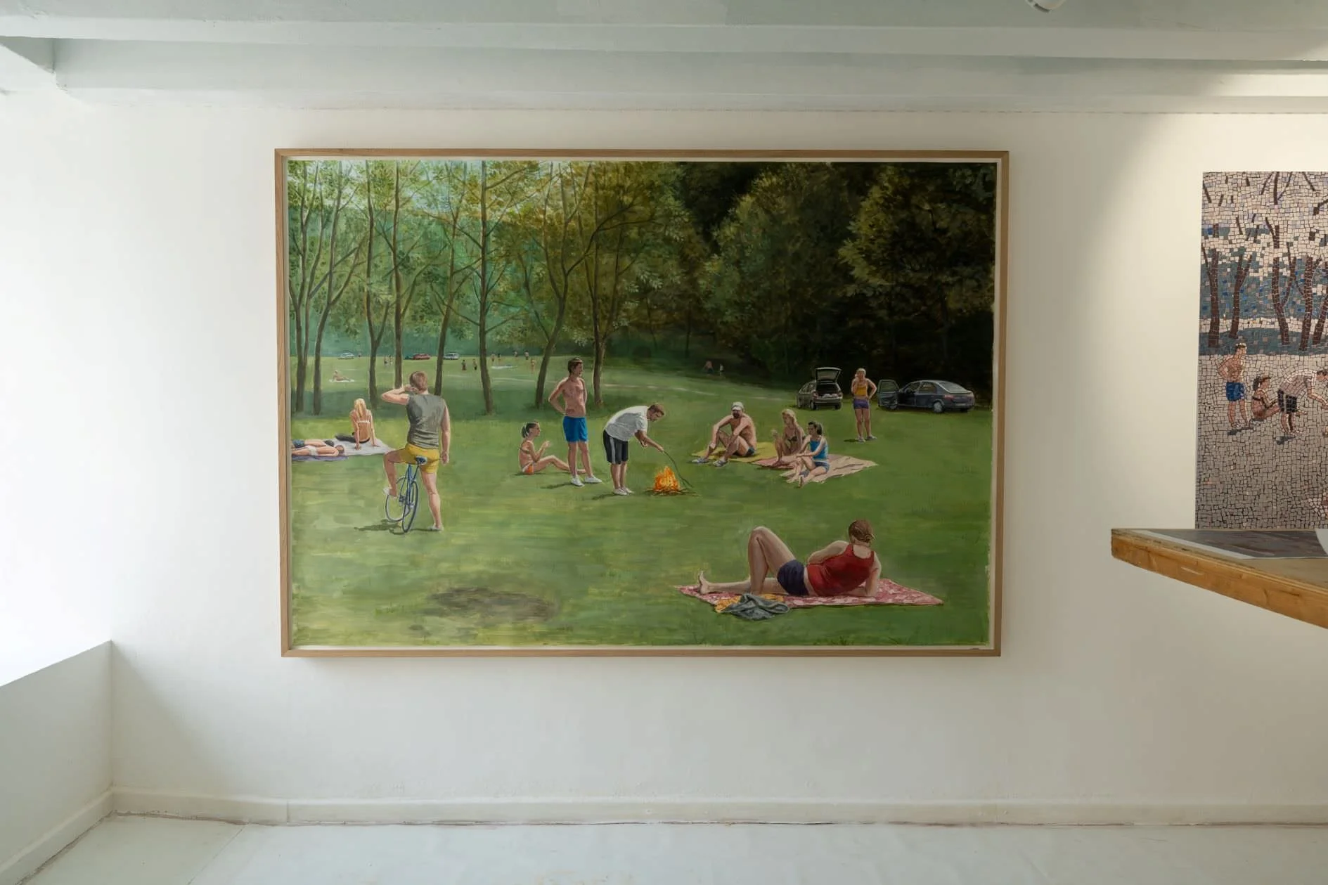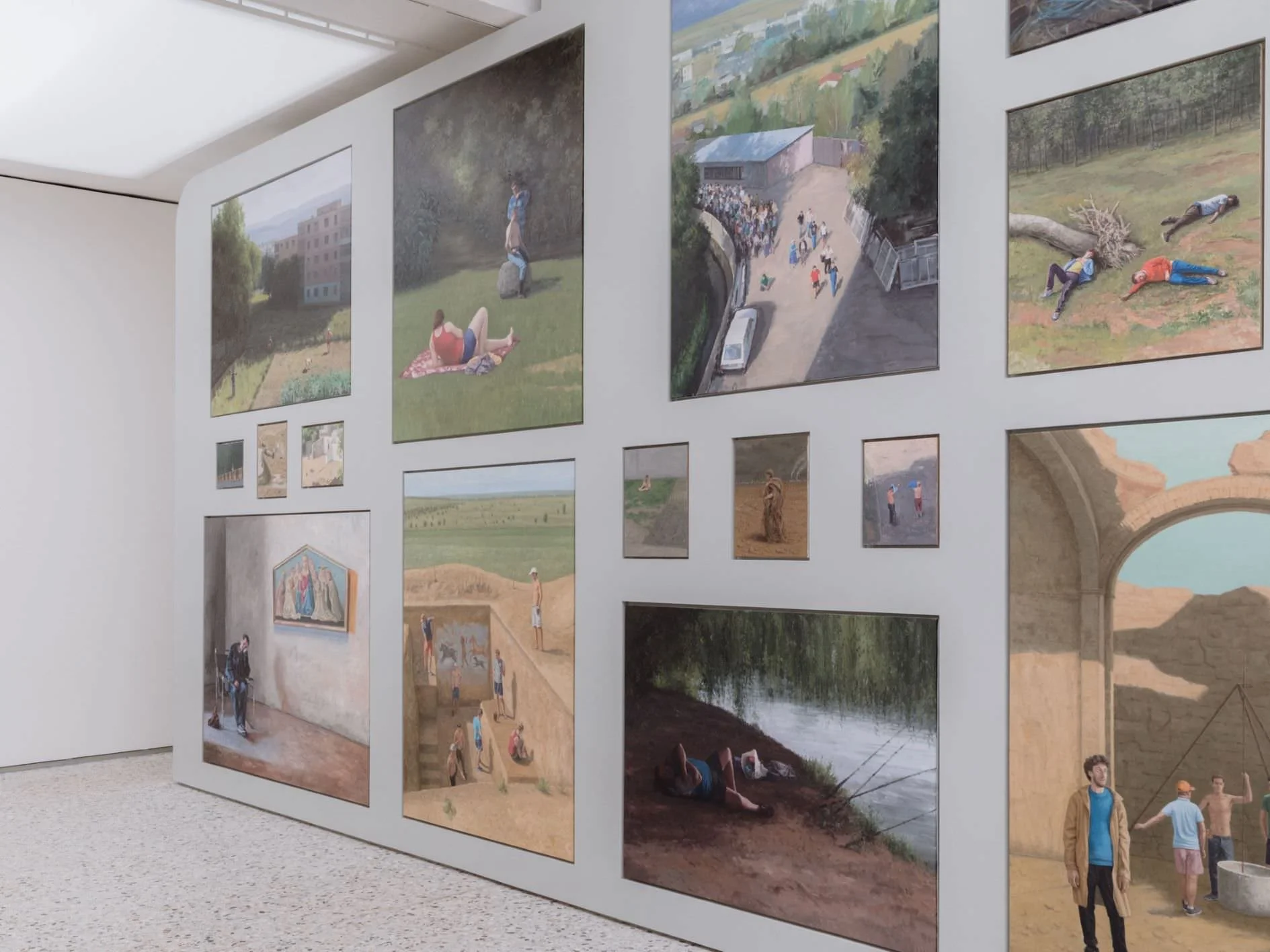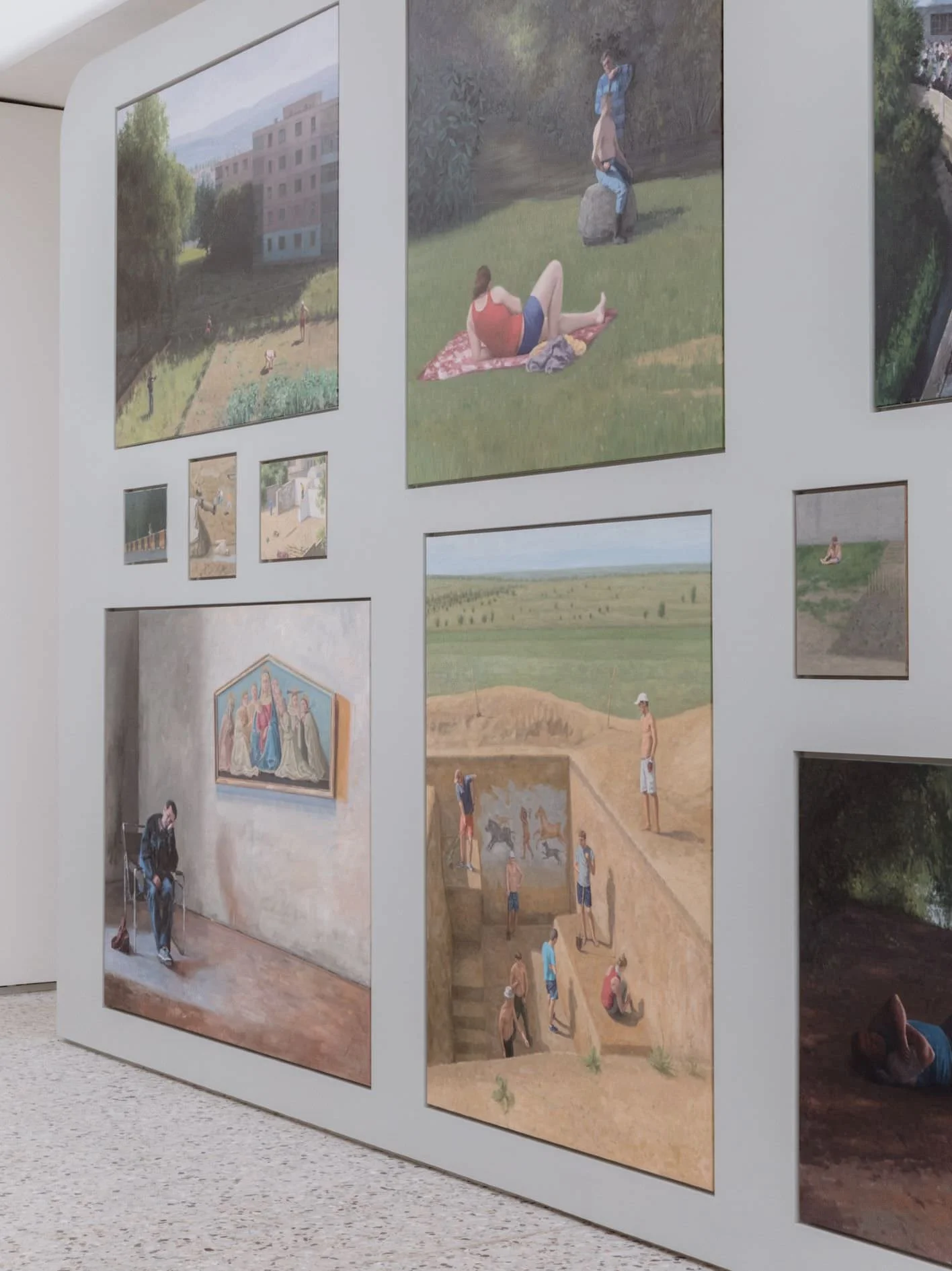 Nato nell’83 ad Adis Abeba, Tesfaye Urgessa, considera le sue composizioni come fossero un’ordinata cantina o dei surreali collages senza colla ne ritagli. Così, inserisce all’interno dei dipinti immagini diverse (a un primo sguardo verosimili ma mai realistiche), che gli vengono in mente in momenti diversi e sono il risultato di domande e sentimenti non sempre omogenei. Tanto che lavora su più opere contemporaneamente e tiene in studio ognuna per almeno un anno (alla fine sceglie se conservarle o rifarle daccapo). Dopo essersi laureato in arte e design all’Università di Adis Abeba (i suoi insegnati erano artisti etiopi che, com’era consuetudine fino agli anni ’80, erano stati mandati in Russia per imparare le tecniche del Realismo Socialista), si è specializzato all’Accademia Statale di Stoccarda in Germania (dove ha continuato a vivere fino a poco tempo fa). Questo gli ha permesso di conoscere da vicino i maestri dell’arte europea sia del passato remoto (ha detto, ad esempio, che l’equilibrio tra luce e ombre nelle sue opere fa spesso riferimento a Caravaggio), che del modernismo, oltre ai grandi nomi della pittura contemporanea. Nonostante ciò, un particolare che ha contribuito a forgiare il suo stile almeno quanto il confronto con questi giganti, viene dalla sua vita privata. Ha infatti sposato l’artista tedesca Nina Raber-Urgessa (anche lei usa la pittura e fa figurazione) specializzata in arteterapia (i due hanno tre figli e dal 2022 abitano in Etiopia). E le surreali composizioni del Signor Urgessa che metteno in scena una teatralità stralunata hanno molto a che fare con l’elaborazione di elementi onirici.