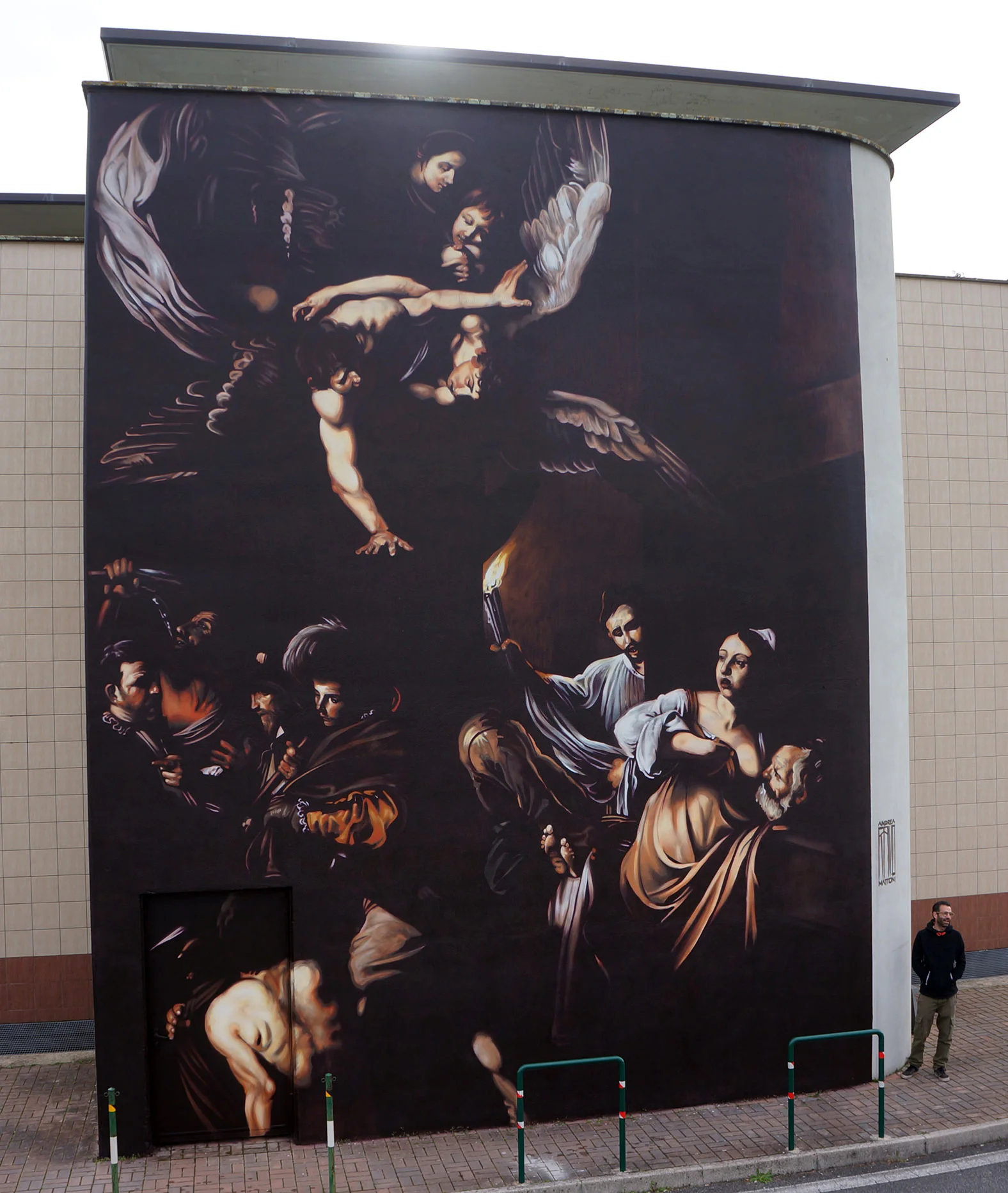Senza dimenticare che cambiando il supporto (un edificio anziché una tela) anche le dimensioni si modificano. Nel caso dell’opera di Roma ad esempio, se l’originale di Michelangelo Merisi detto il Caravaggio misura 390 centimetri per 260, il murale di Andrea Ravo Mattoni arriva a 8 metri di base per 9 e mezzo d’altezza.