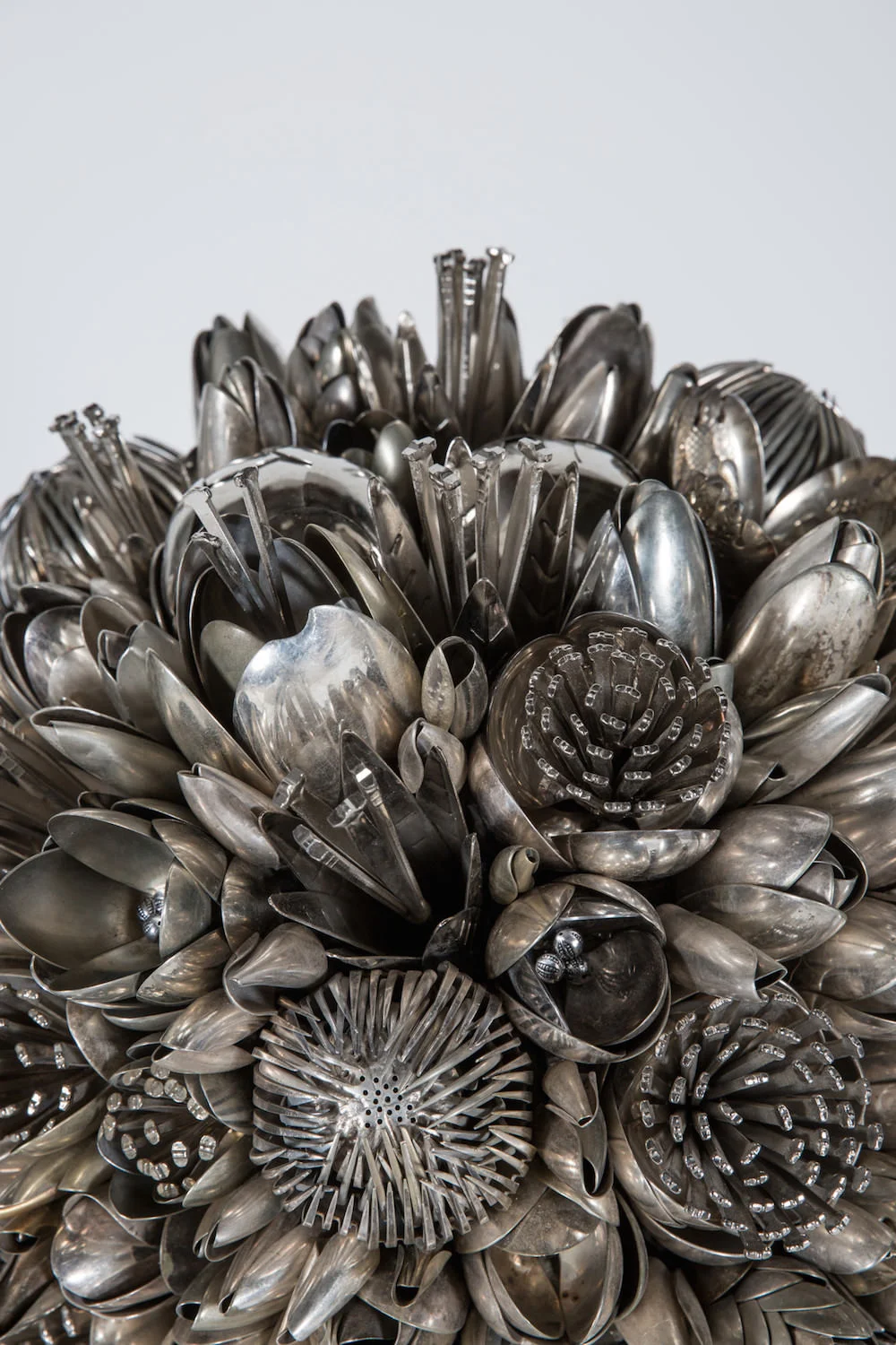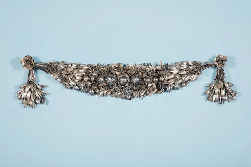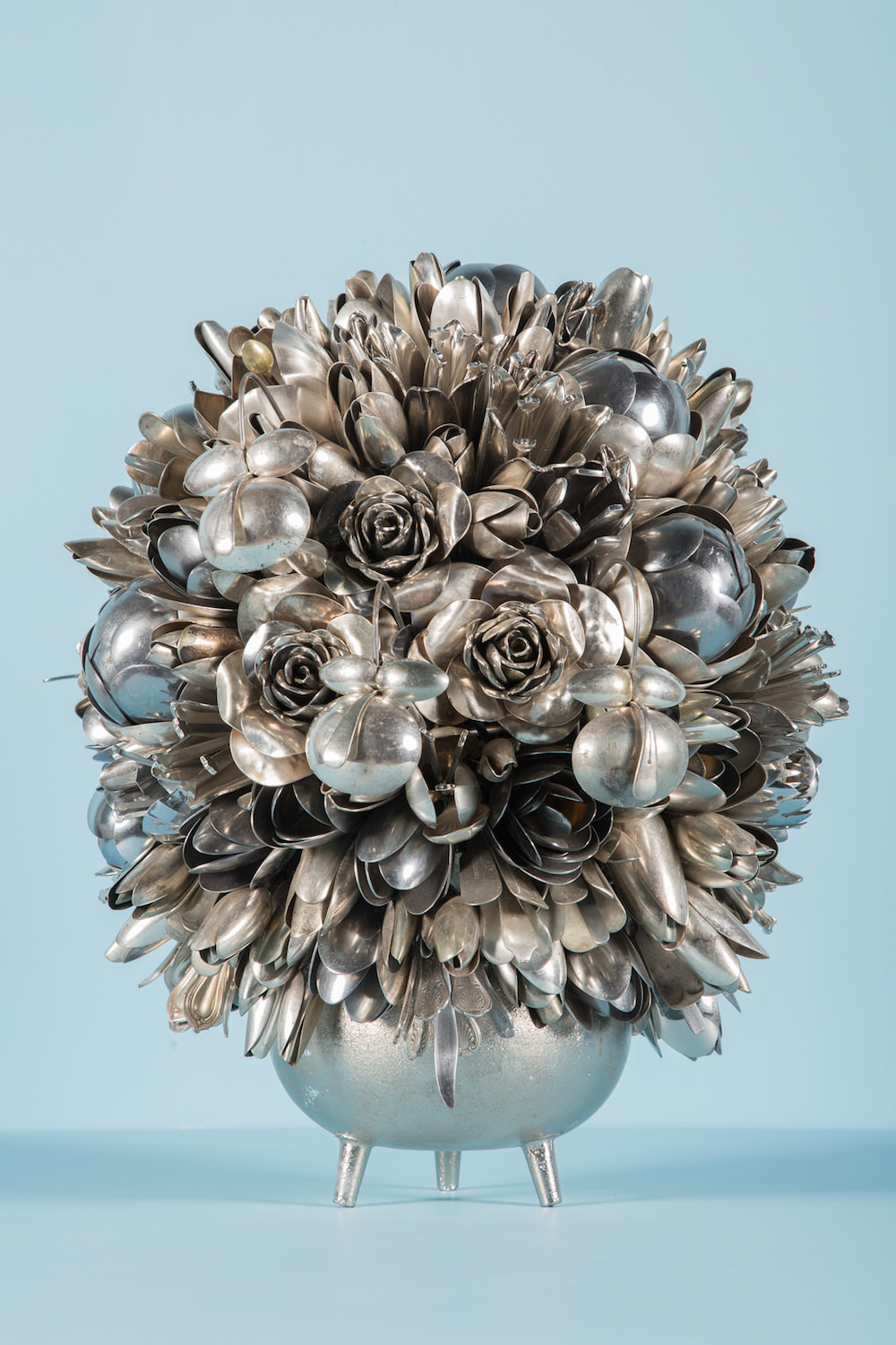Nella serie “Bouquets and Butterflies”, per esempio, Ann Carrington ha usato centinaia tra cucchiai, cucchiaini e forchette per comporre degli elaborati mazzi di fiori. Rose, tulipani e gigli metallici che ricordano la tradizionale produzione inglese di pregiati oggetti in argento.