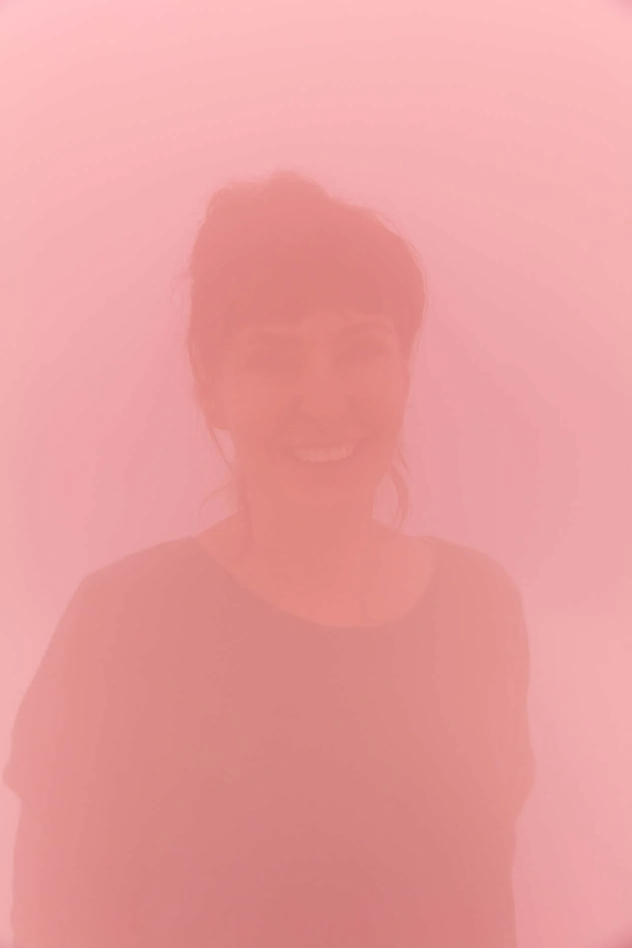 Sulle altalene, lascia traccia del proprio passaggio, attraverso una pellicola termoreagente che muta di tonalità a contatto con il calore del corpo. Per trovarsi poi a cospetto con l’assenza di punti di riferimento spazio-temporali, ne “L’espace infini” (1999) (l’opera è una struttura concava rettangolare, priva di angoli e bordi, l’ambiente è bianco, talmente bianco che per un effetto ottico lo sguardo non riesce più a distinguere dimensioni e limiti). Simile ma peggiore l’esperienza di o “MUKHA, Anvers” (1997-2023), un ambiente isolato dal resto della mostra che da fuori sembra un grande ma banalissimo cubo bianco. Quando si entra però la musica cambia, Janssens, ha riempito la stanzetta di fitta nebbia artificiale e ha lasciato che l’illuminazione naturale rendesse ancora più vaghi i confini dello spazio e più sfumate le forme dei corpi in movimento. Risultato? Il completo spaesamento. Ci si sente alla deriva, spesso irrazionalmente incapaci di fare un passo ma la sensazione che si prova non è del tutto sgradevole. L’artista, ha spesso raccontato di stupirsi per i messaggi che le mandano le persone che hanno affrontato quest’opera, diverse volte ha persino ricevuto ringraziamenti da parte di donne che tra la nebbia di “MUKHA, Anvers” hanno incontrato quello che sarebbe diventato il loro marito.
