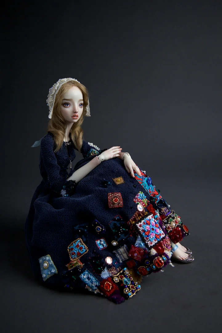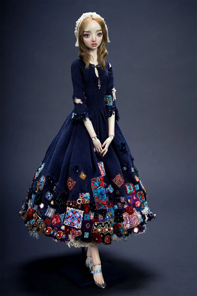Il volto e il corpo vengono dipinti con attenzione. Ma non solo, perché gli abiti, gli accessori e le scarpe sono ricamati con cristalli e pietre semi preziose (se non addirittura preziose). E nella composizione, la Bychkova, arriva ad inserire oggetti rari che recupera nei negozi di Vancouver, la sua città adottiva.