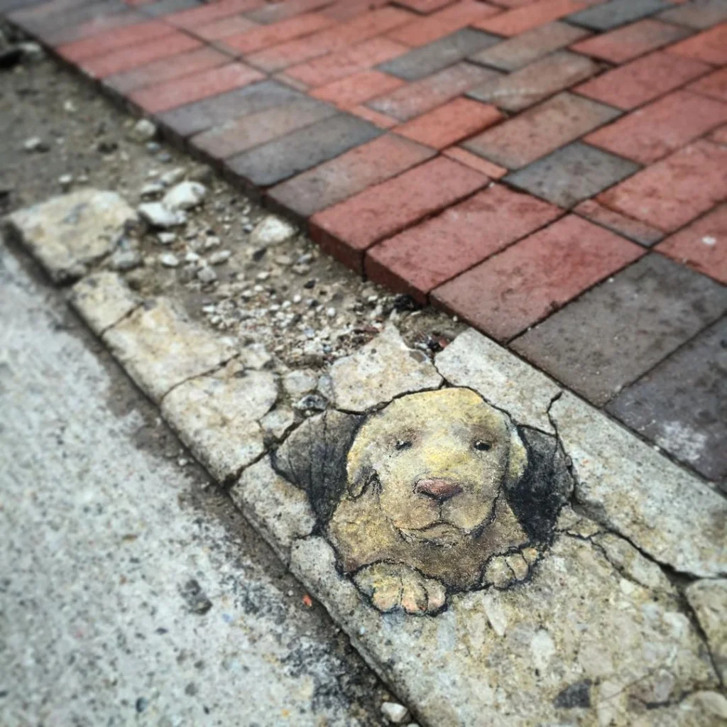 E’ dall’87 che David Zinn disegna sulle strade e sui muri della città. Con gessetti o carbone, strutturando l’immagine intorno a un particolare che ha notato (una crepa, una distesa di foglie, ma anche dei semplici gradini o mattoni). E, a volte incorpora elementi degli oggetti trovati.