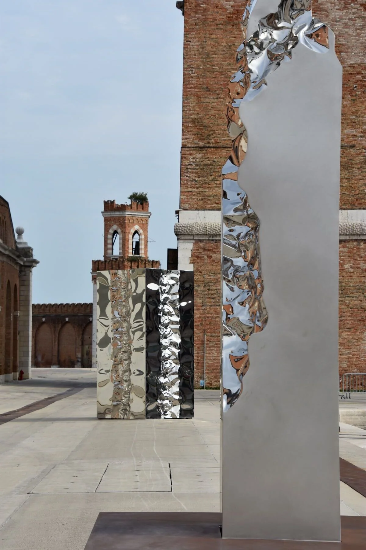 Un lavoro che pesa 700 chili e che, insieme ad altre sei sculture (“Cattedrale d’acciaio”, “Roccia Marina”, “Riflesso Lunare”, “Getto di Luce”, “Ordine e Caos”, “Satellite”), è stata installata alle Tese dell’Arsenale. E’ l’unica che si fa trasportare dolcemente dall’acqua (richiamando alla mente i cambiamenti climatici) ma come le altre riflette, moltiplica e distorce ciò che le stà intorno. Diventando un momumento al pesaggio ma oprattutto alla luce. Mobile eppure fermo, camalontico eppure immutabile.