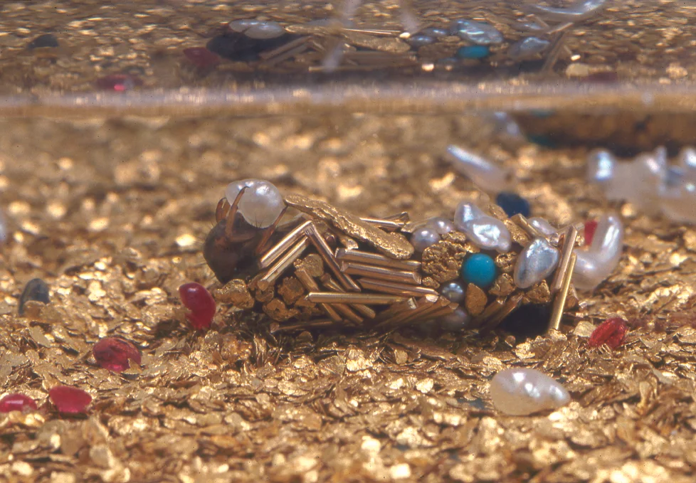 Le sculture dell’artista francese Hubert Duprat, sono tanto piccole quanto preziose. Misurano in media dai 2 ai 3 centimetri e sono fatte di scaglie d’oro, perle, turchesi, corallo e pietre. Nessuno guardandole potrebbe immaginare che a farle siano stati degli insetti. Delle larve, anzi. Di tricottero.