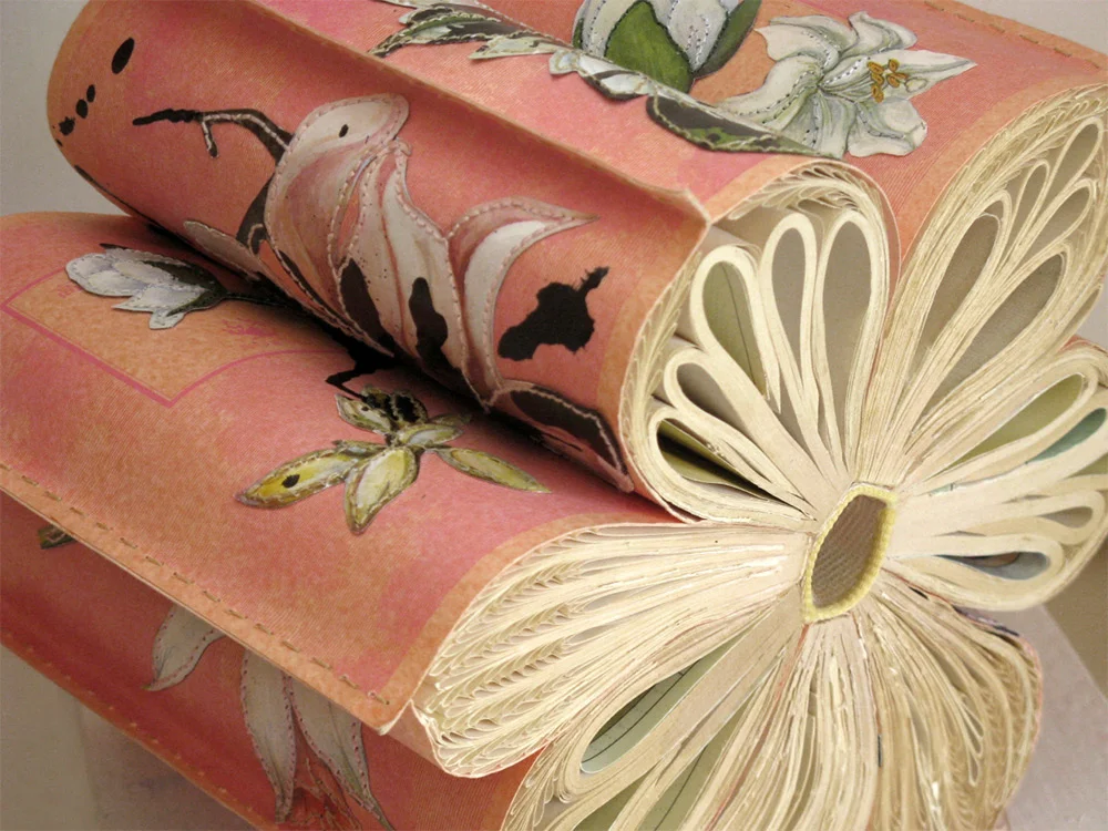 Le pubblicazioni di cui si serve Jacqueline Rush Lee sono spesso d’epoca. Non preziose, in senso stretto, ma ricercate, dotate già di per se di una personalità. A seconda del libro che le capita per le mani, l’artista usa i colori o lascia le pagine libere di mostrare la loro bellezza, come se illustrazioni e caratteri diventassero elementi decorativi. Poi assembla, piega, incolla, taglia e tramuta i libri in sculture dalle forme morbide e dotate di una buona dose di dinamismo.