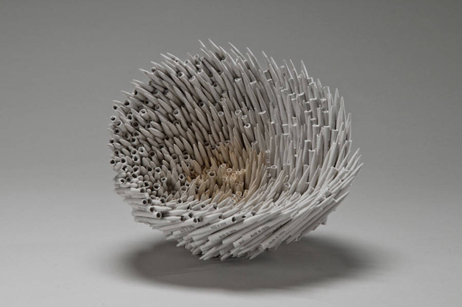 Jacqueline Rush Lee è originaria dell’Irlanda del Nord ma vive e lavora alle Hawaii. Realizza con metodo e pazienza delle elaborate sculture di carta che a volte si ispirano alla bellezza dei tropici (fiori, anemoni ecc.) altre sono pure forme astratte. Per farle usa solo libri.