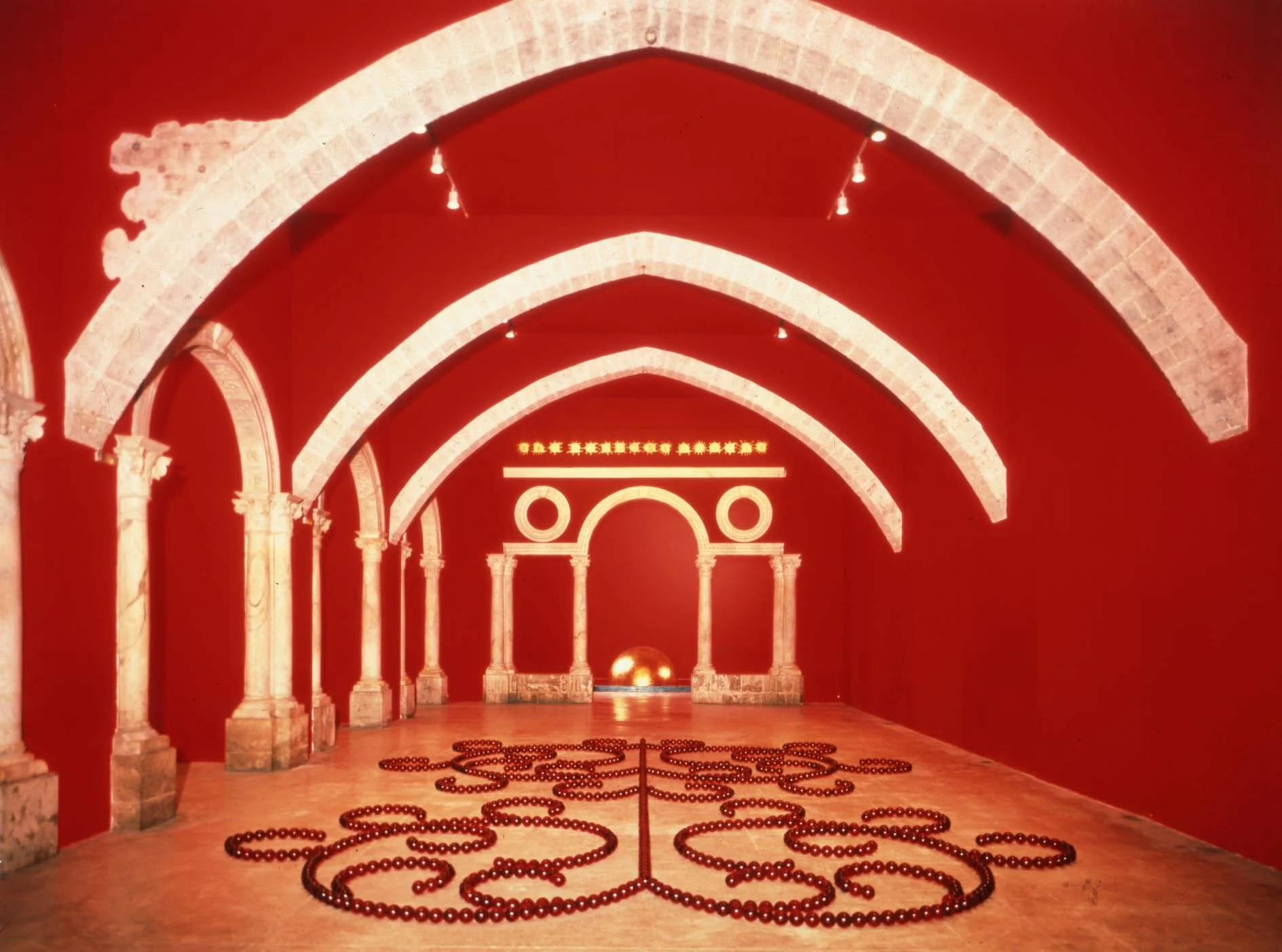 James Lee Byars Red Angel of Marseille, 1993 Vetro rosso, 1000 parti Ciascuna: ⌀ 11 cm Totale: 1100 x 900 x 11 cm FNAC 99316 Centre National des Arts Plastiques In deposito presso Centre Pompidou, Parigi Veduta dell’installazione, IVAM, Instituto Valenciano de Arte Moderno, 1995 © The Estate of James Lee Byars, courtesy Michael Werner Gallery, New York e Londra