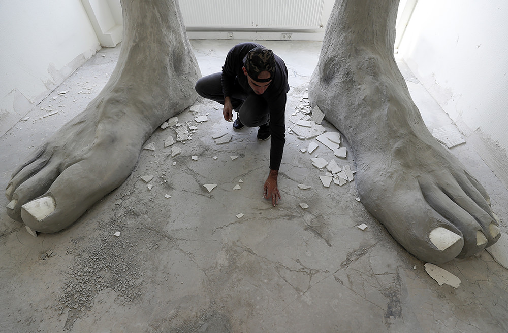 Ci sono calcinacci dappertutto e due piedi giganti sembrano aver sfondato il soffitto. L’impressione è che il resto del corpo della enorme creatura si trovi ai piani superiori. Ma per fortuna l’installazione dello street-artist spagnolo Mario Mankey in una banca abbandonata di Berlino si ferma lì.