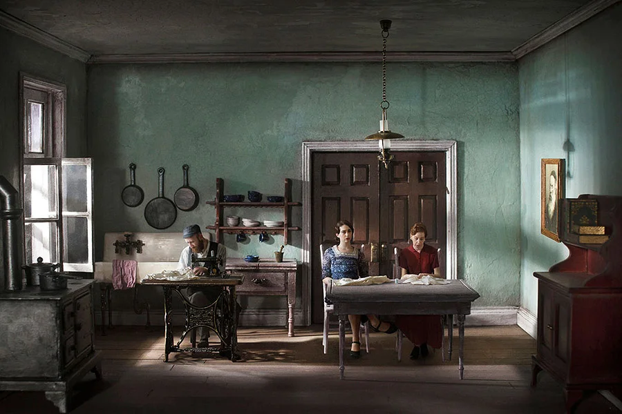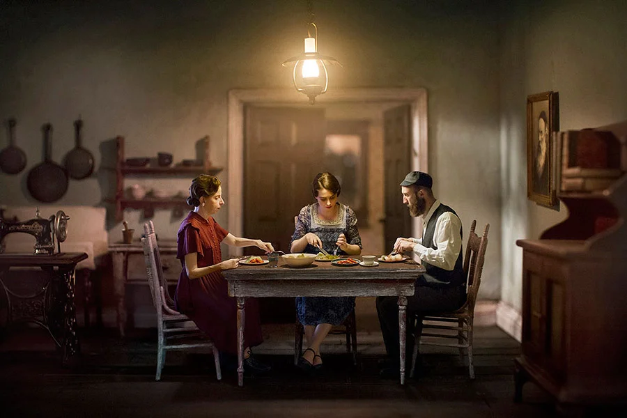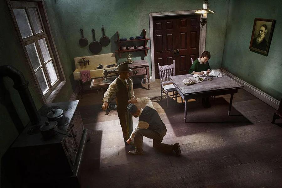 In realtà, le immagini di Richard Tuschman, sono frutto di un procedimento molto lungo e complesso. Che comincia costruendo un diorama del luogo in cui gli scatti sono ambientati.