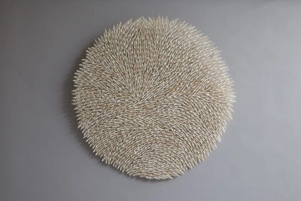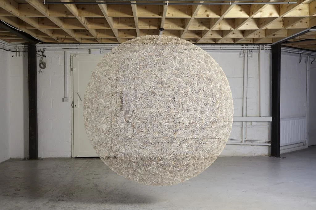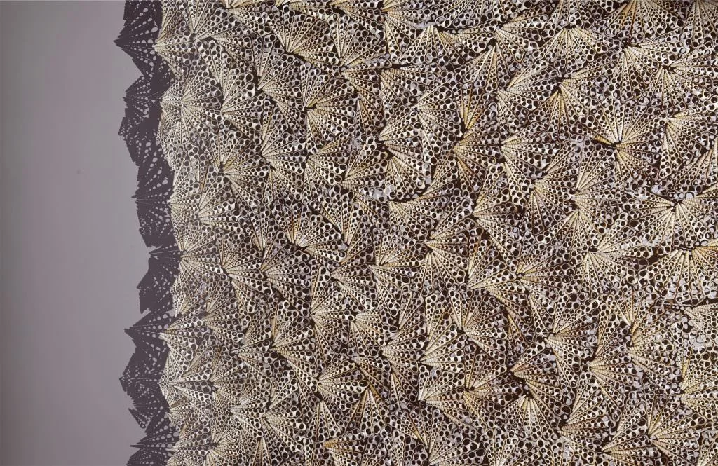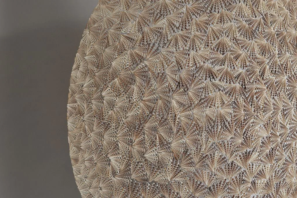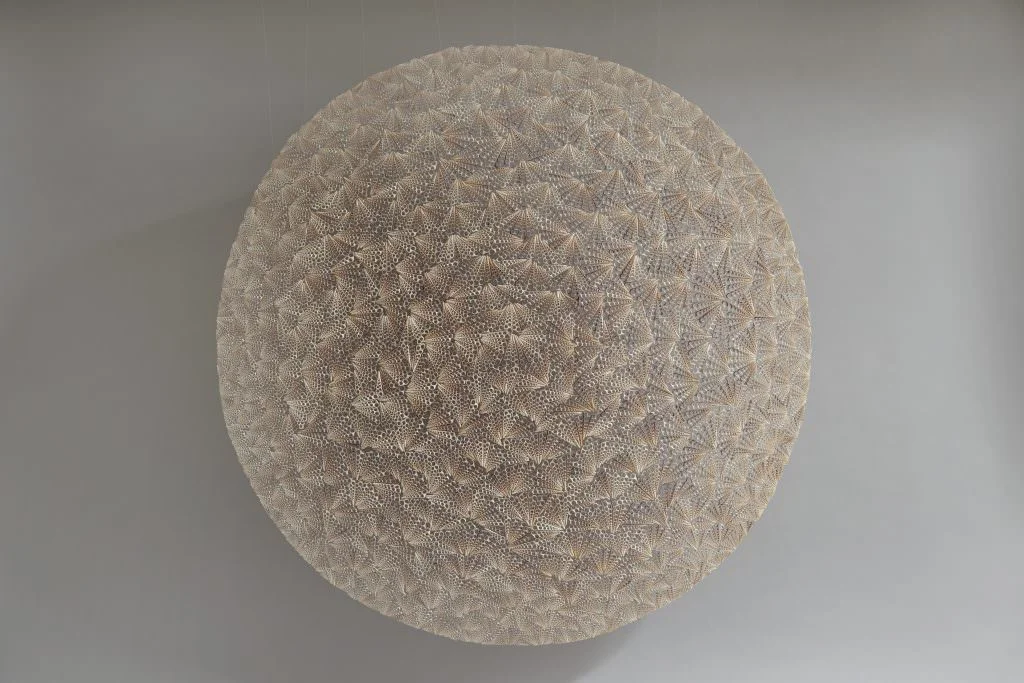 Ad interessarlo anche l’unicità di ogni guscio, che trova poi il modo di far combaciare ad altre migliaia. Come un complesso puzzle 3d. Il risultato sono composizioni che, perse rigidità e immobilità, si mostrano flessuose e dinamiche. Leggere, persino malleabili.