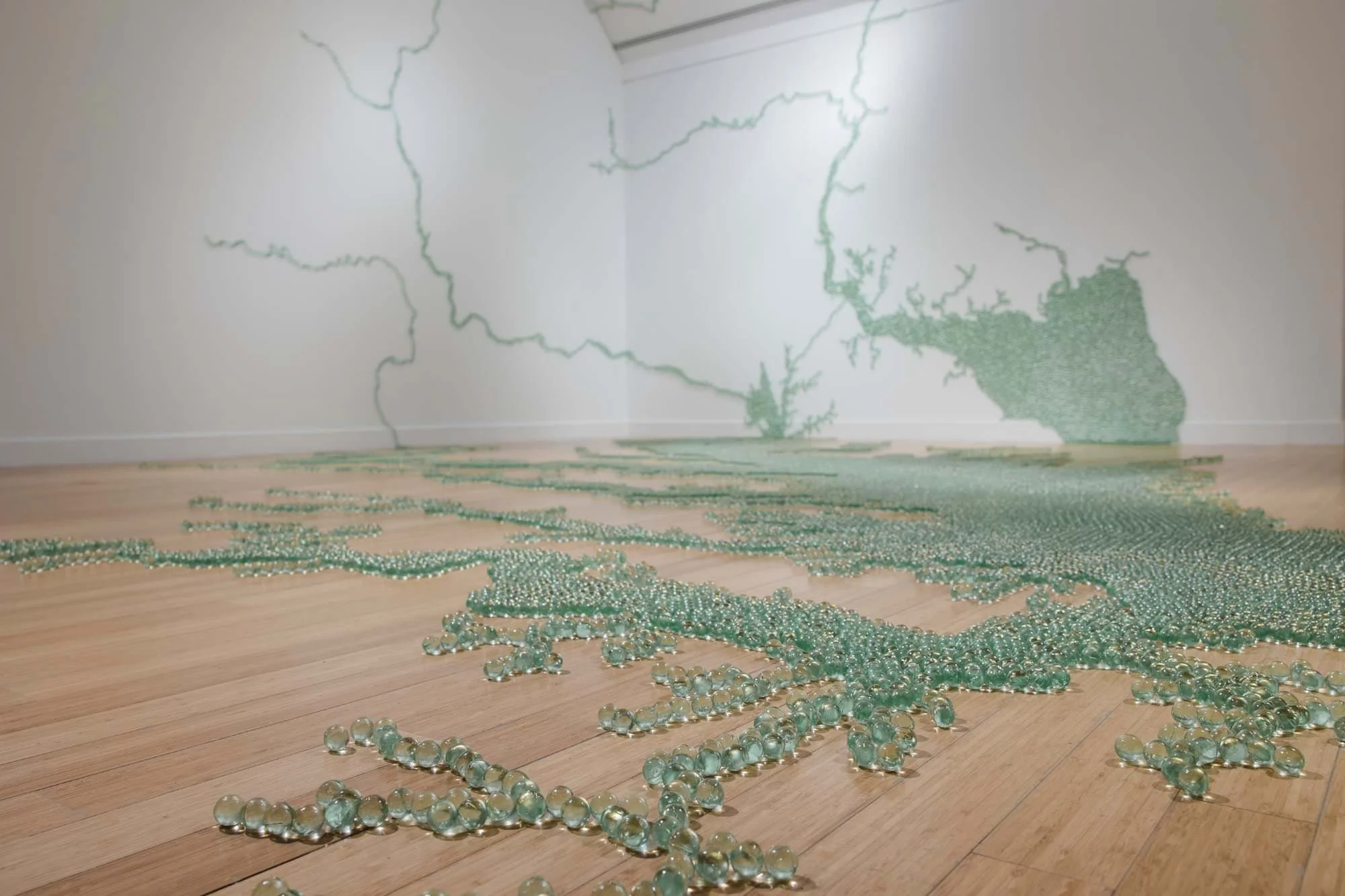 Fatta solo con migliaia di biglie di vetro trasparente ed adesivo “Marble Chesapeake and Delaware Bay” è una scultura semplice ed evocativa della famosa artista statunitense, Maya Lin. Basata su un disegno che lei ha tracciato ispirandosi alle foto satellitari della NASA, l’opera attualmente si estende sulle pareti e il pavimento del Virginia Museum of Contemporary Art (dov’è in corso la personale: “Maya Lin A Study of Water”). Ma Lin l’aveva già pazientemente assemblata anche altrove. Come dice il titolo, rappresenta la Baia di Chesapeake and Delaware. Cioè il più grande estuario dell’nord America.
