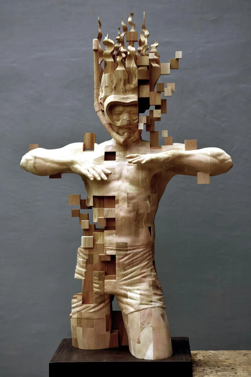 Sono ritratti iperrealisti con dei pixel cubici qua e là, che interrompono l’illusione dello spettatore di trovarsi di fronte a un proprio simile (seppur color legno) e lo riportano alla cruda realtà: sta’ guardando la copia scultorea di un’immagine digitale. Ma di un’immagine tridimensionale che in quanto tale un po’ di inquietudine la crea.