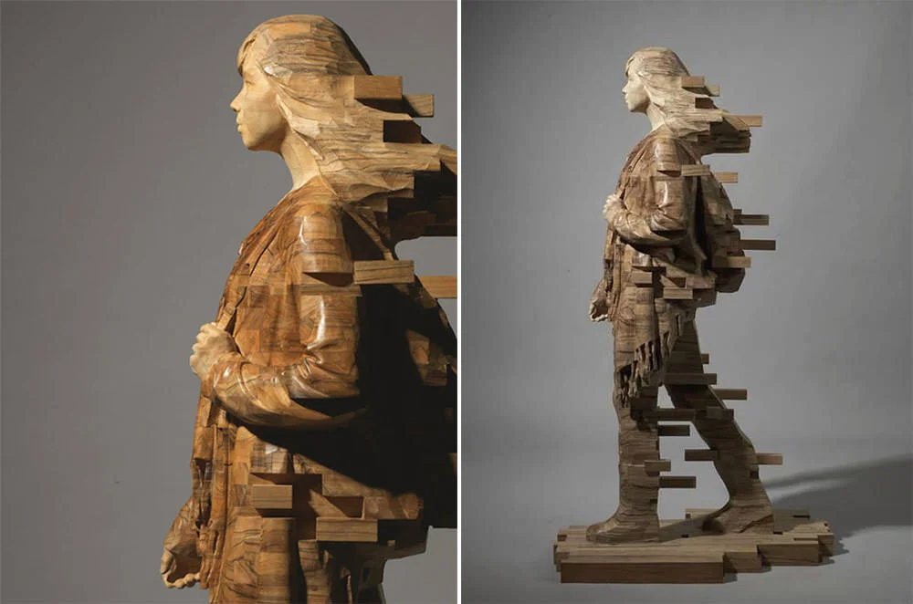Le sculture in legno del taiwanese Hsu Tung Han non aspirano a rappresentare la realtà ma degli ologrammi mal riusciti.