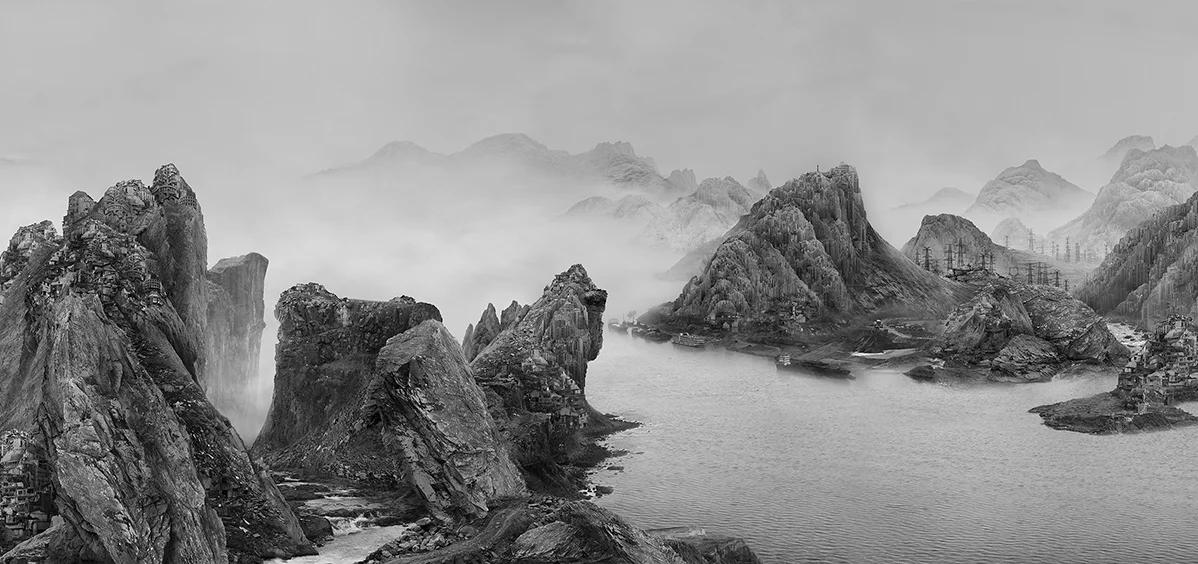 Il canovaccio delle sue opere è sempre composto da una pace fittizia prima della tempesta. Prima che l’occhio abbia il tempo di indugiare nei minuti particolari dei panorami solo apparentemente sereni. Di rendersi conto che le montagne sono popolate di grattacieli anziché di alberi e le cascate sono frutto dell’erosione del terreno. Perché l’artista attraverso le sue spettacolari immagini ci parla di urbanizzazione selvaggia e natura, di frenesia e pace. Contrapponendo la Cina di ieri a quella di oggi ma anche passato e presente in termini generali.