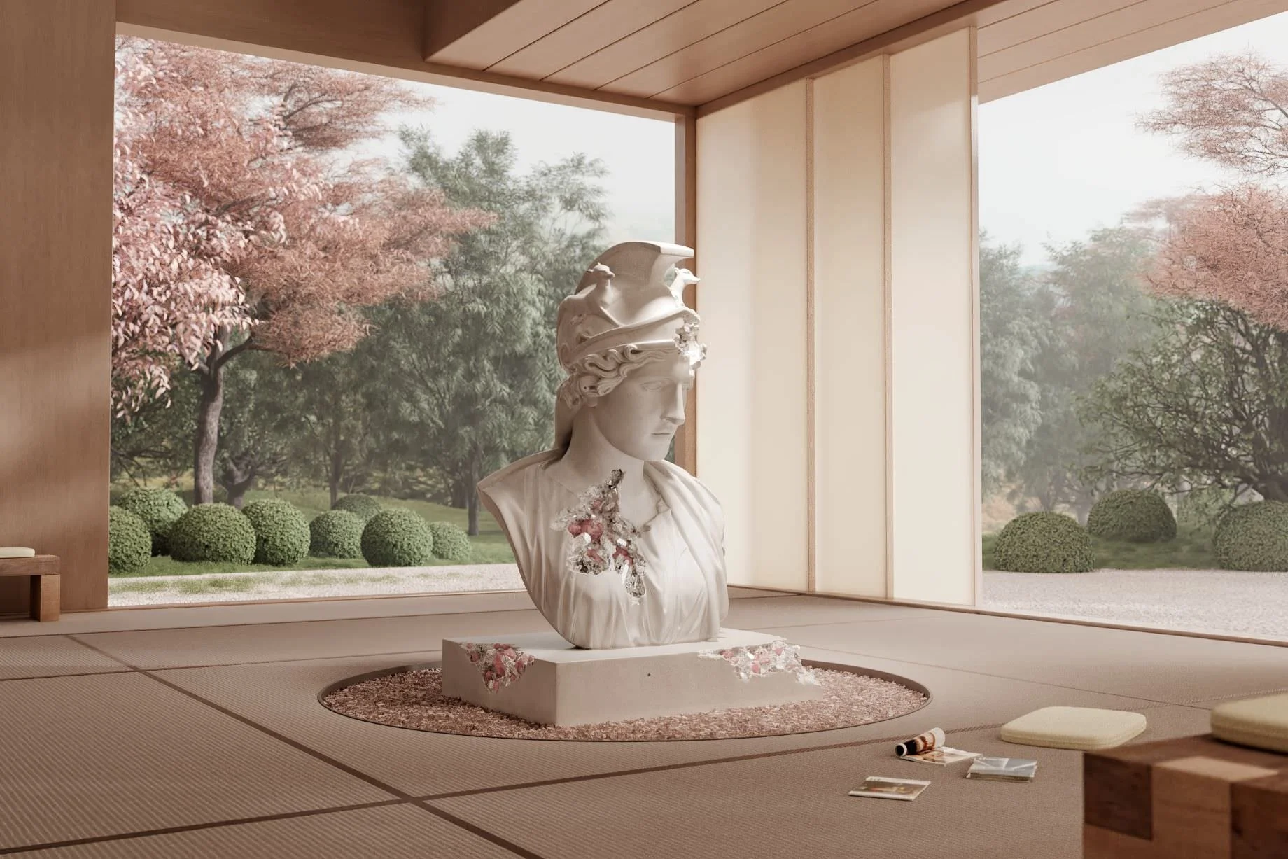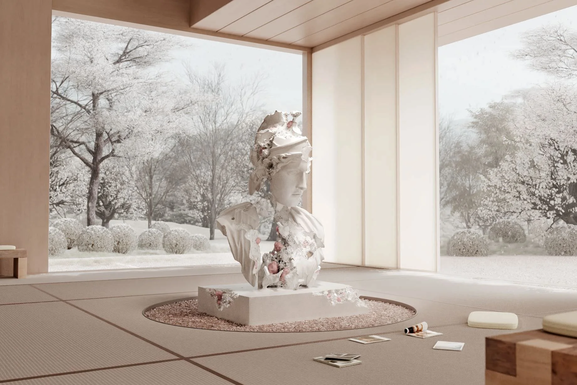 Ma anche il busto del Louvre proveniente dalla Collezione Borghese che si forma ed erode continuamente dello statunitense Daniel Arsham. Dietro di lui le stagioni cambiano, in omaggio alla ciclicità orientale e a un gusto per la bellezza senza tempo, che Arsham affianca sempre alle sue opere legate a un concetto di futuro di ineluttabile scomparsa e solitudine (anche la scultura protagonista di quest’opera è programmata per scomparire del tutto nel corso di mille anni).