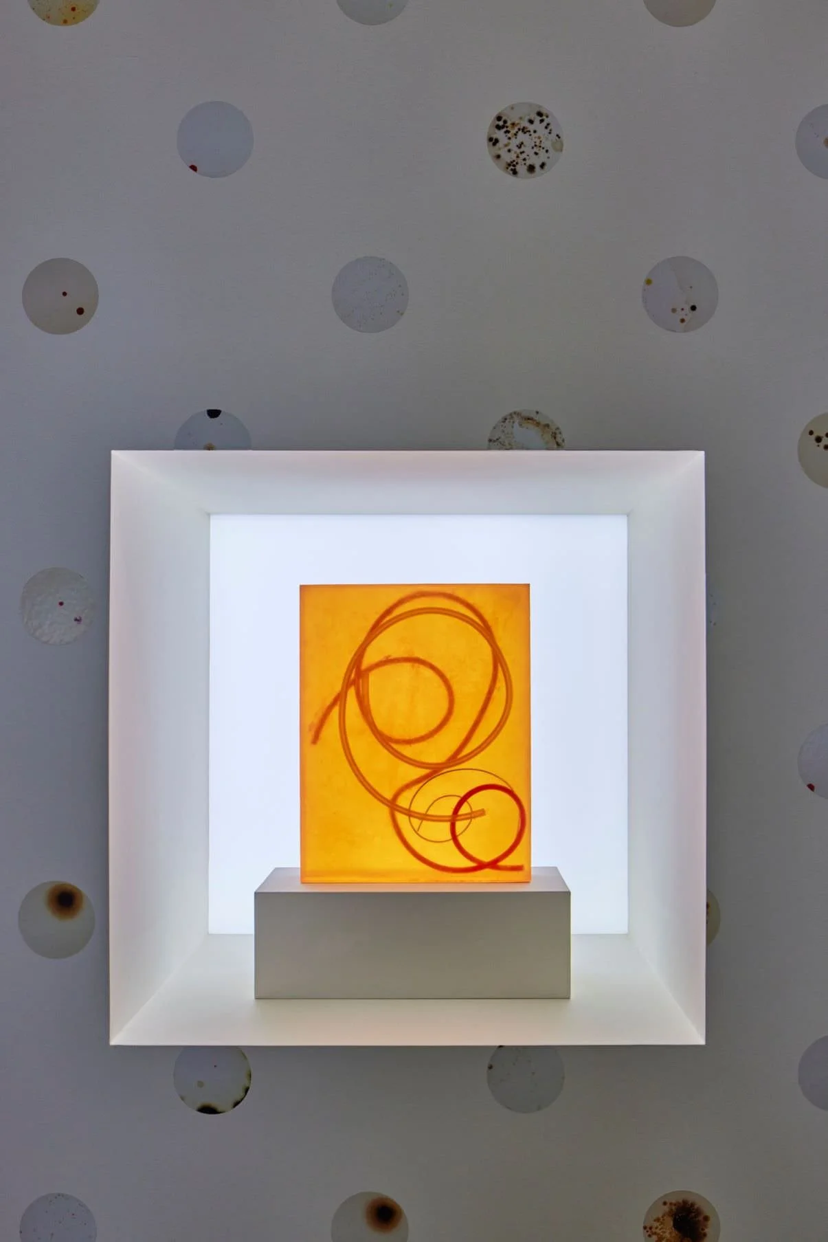 Appena entrati sembra di varcare un secondo ingresso mentre si attraversa la galleria composta da quelle che in realtà sono due installazioni più o meno uguali (Effectively Synergizing Backward Overflow e Ice Water in the Veins). Bianche, con sopra stampati quelli che a prima vista possono sembrare pattern decorativi (in realtà batteri al microscopio), ospitano delle piccole vetrine retroilluminate. Nelle teche c’è un po’ di tutto ma senza ricorrere alla guida messa a disposizione dall’Hangar (gratuita ma un po’ piccola per chi soffre anche del minimo problema alla vista) non ci si arriverebbe mai. E’ una delle caratteristiche più spiccate del lavoro di Yi, che si ritrova in buona parte delle opere in mostra: visivamente piacevoli, a volte persino apparentemente preziose, possono essere fatte di materiali improbabili o sgradevoli. Come ci riesca non si sa.