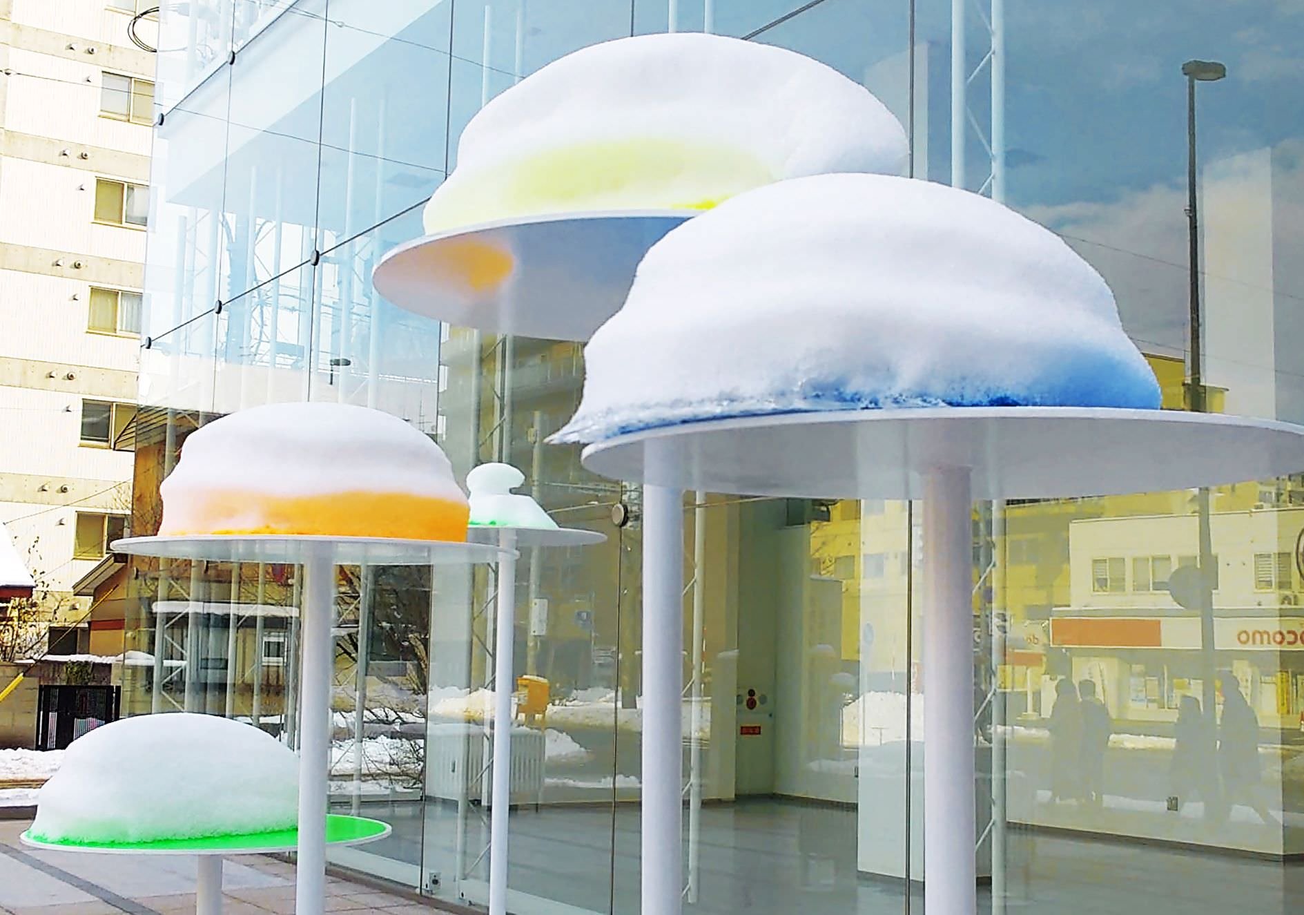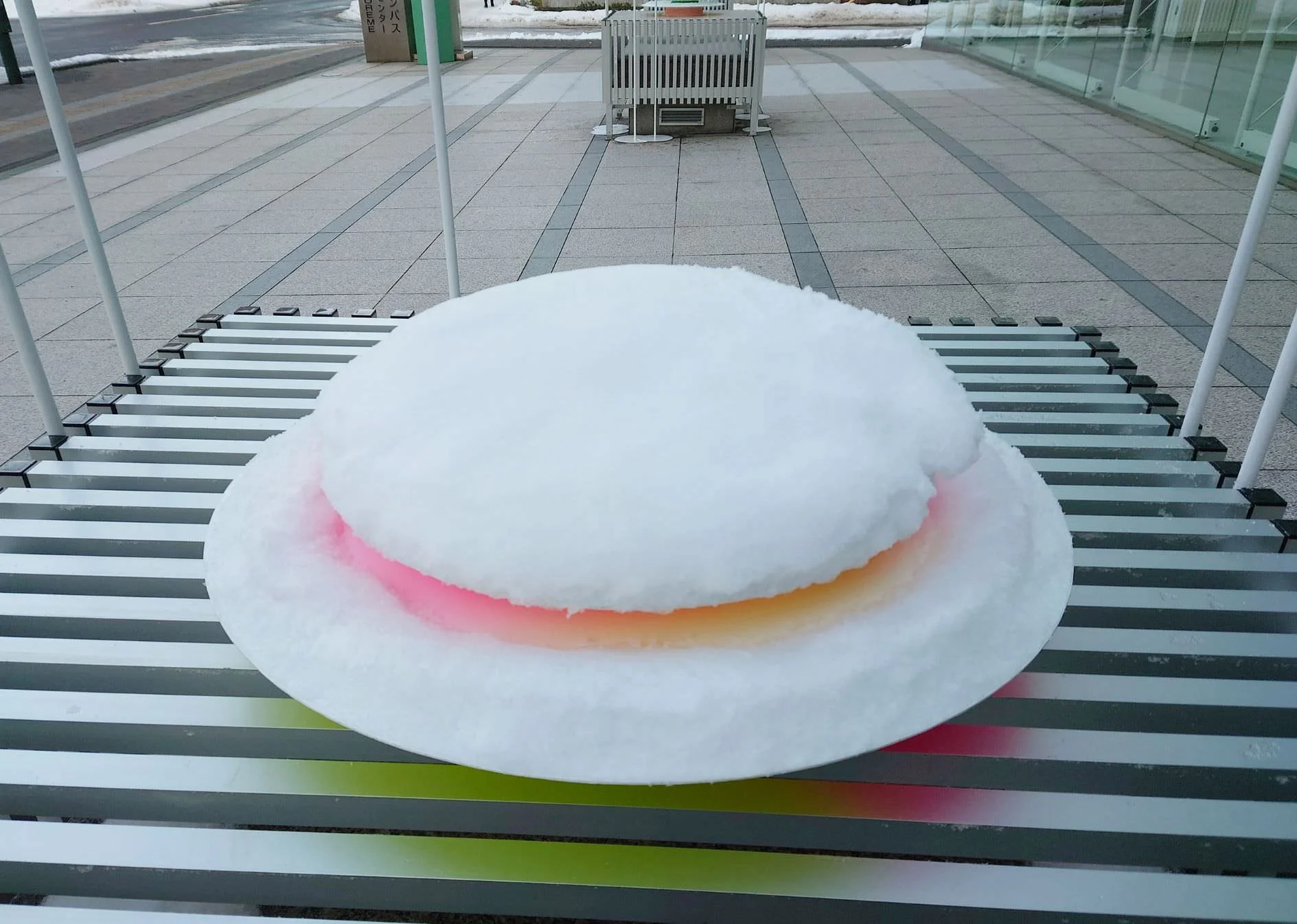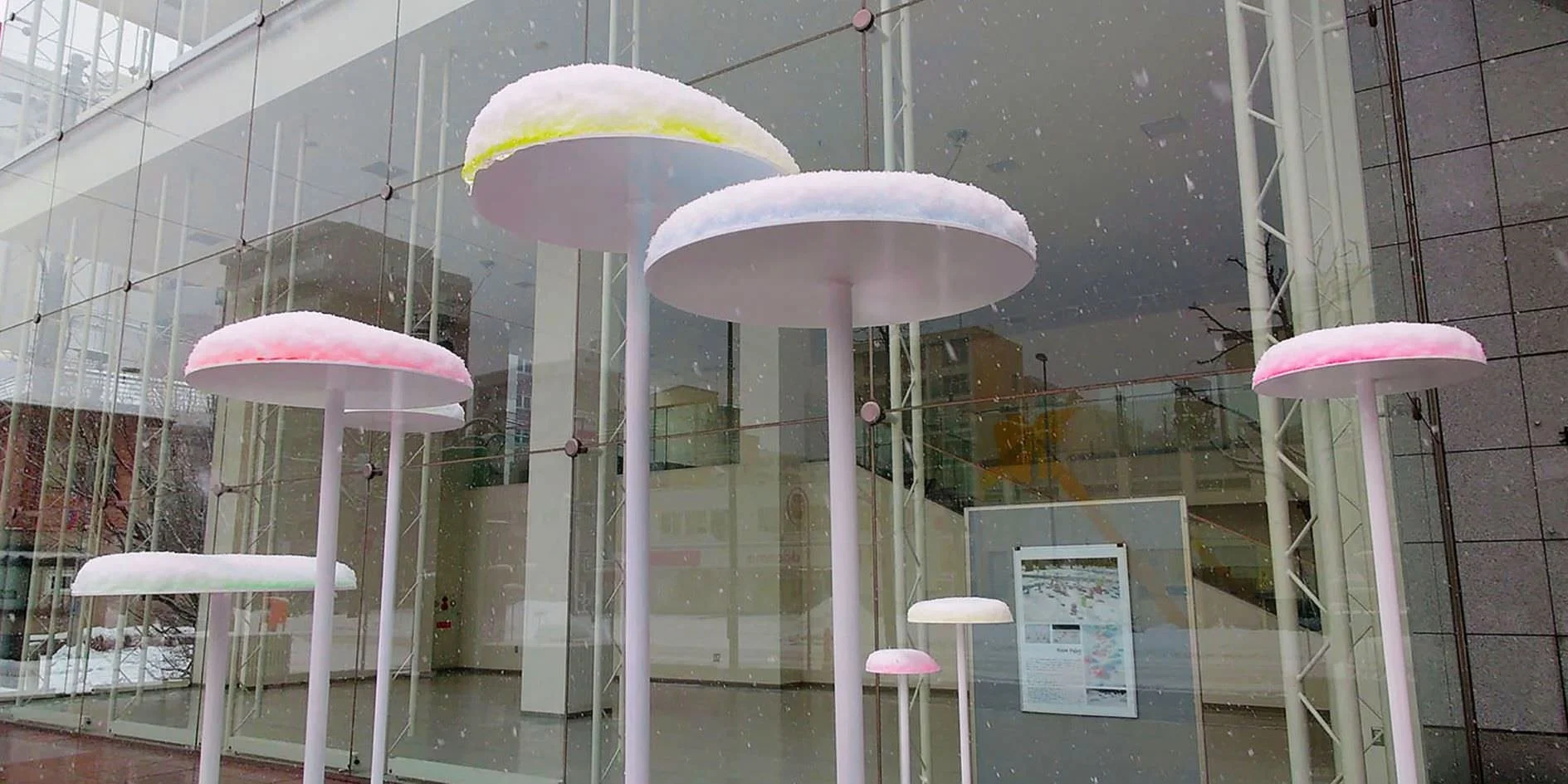 La diciasettesima versione della serie scultorea “Snow Pallet” di Toshihiko Shibuya è stata più breve del solito. I consueti elementi, a forma di tavolino, ombrellino o fungo stilizzato (in sintesi: cerchi e linee perpendicolari gli uni alle altre), dipinti in colori fluorescenti, vivacissimi e briosi, sono rimasti posizionati all’ingresso del campus Maruyama dell'Università di Hokusho meno di un mese: dal 27 dicembre al 5 gennaio. Eppure la neve, anche questa volta, ha saputo trasformarli giorno dopo giorno in maniera sostanziale.