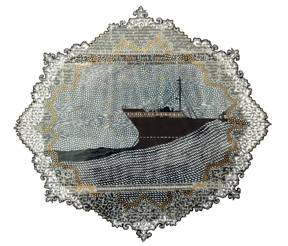 Impedos Karen Margolis Impedes, 2018 watercolor, gouache, maps, thread on Abaca paper 14”x11” (particular) Courtesy of the artist and Garis & Hahn