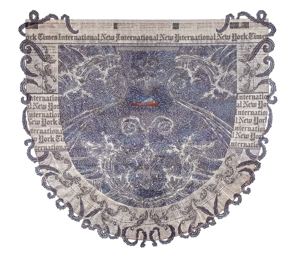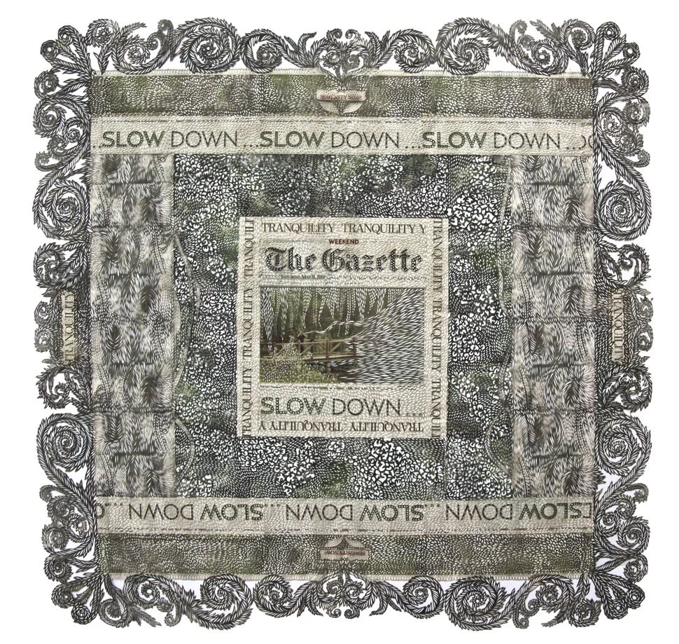 La giovane artista canadese Myriam Dion, infatti, cerca a modo suo di salvare i giornali cartacei dall’avanzare dell’editoria via web, di preservare gli approfondimenti e il giornalismo d’inchiesta dal procedere implacabile delle breaking news. Lo fa esaltando il valore della lentezza e la bellezza della carta stampata. Ma nel farlo cancella le parole con il ripetersi di minuziosi motivi decorativi astratti. Rigorosamente fatti a mano.