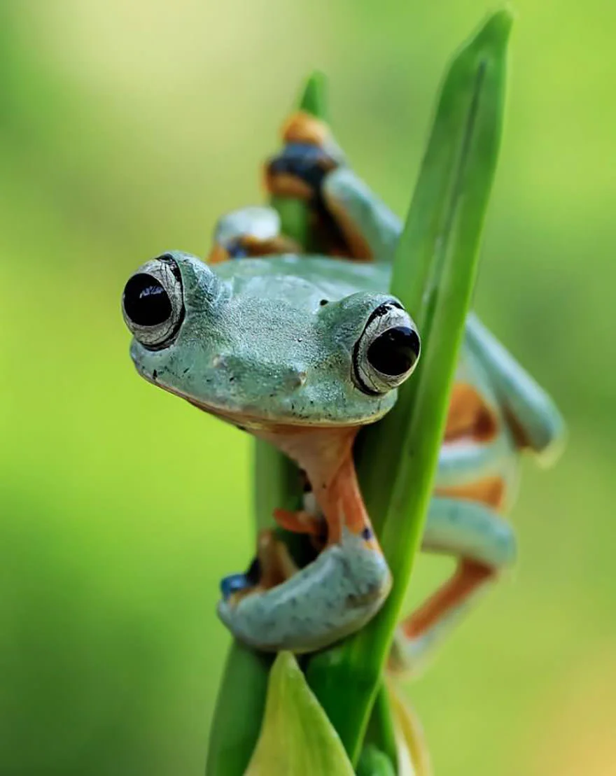 Di certo la raganella del fotografo indonesiano non si è scomposta. Ed ha aspettato pazientemente che le chiocciole smettessero la loro arrampicata e che Yensen finisse di scattare. Senza battere ciglio neppure quando gli invertebrati hanno cercato appiglio accanto ai suoi occhi.