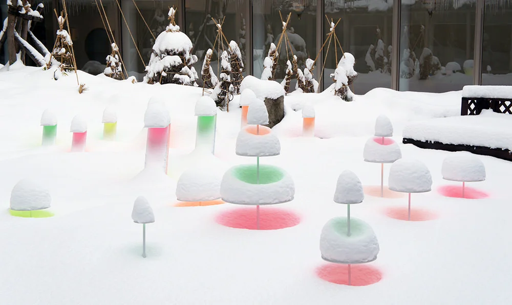 i colori dell'installazione si rifrangono sulla neve con le loro note vivaci e giocose
