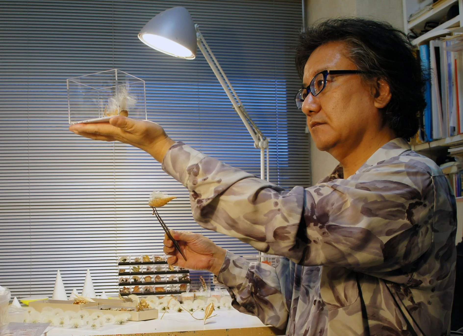 Il Signor Shibuya invece non dipinge. Il suo lavoro, volto a cercare di sottolineare la bellezza delle nevicate o del proliferare della vita nel sottobosco interferendo il meno possibile con il reale, si compone principalmente di installazioni (la serie “Snow Pallet” e la serie “Generation” sono i pilastri della sua attività artistica), cui si aggiungono fotografie che documentano momenti effimeri di vita naturale (i semi che si staccano dai soffioni e prendono il volo; la neve accumulata sui supporti che formano “Snow Pallet” ecc.), ma anche teche in cui conserva reperti del paesaggio cui allude costantemente (come rocce o semi). Tuttavia questo è il risultato di una lunga carriera, di come è cominciata e di tante altre cose abbiamo parlato in un’intervista che Toshihiko Shibuya ha rilasciato ad Artbooms in occasione di un periodo di attività espositiva piuttosto intensa.