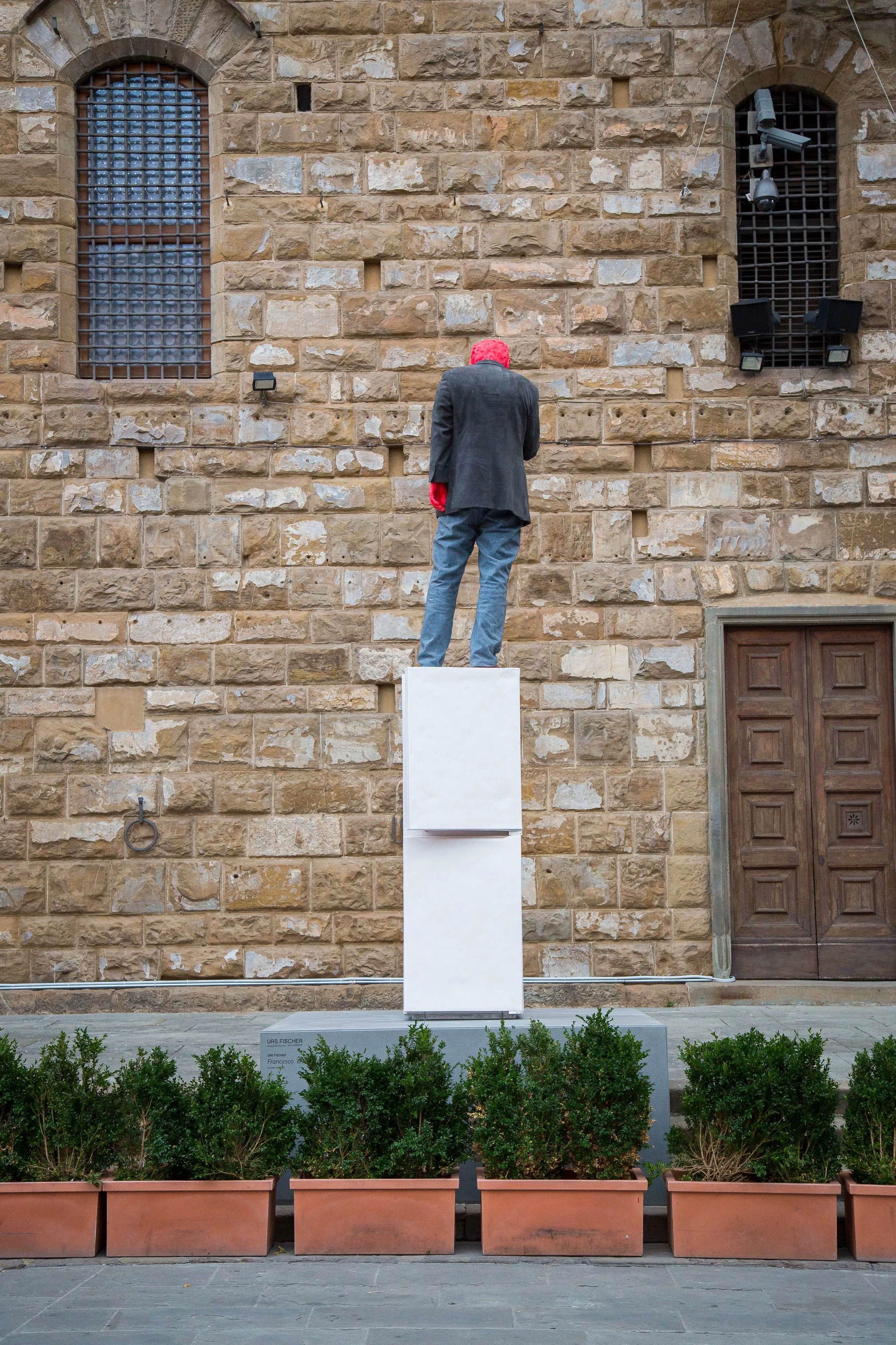 ‘Urs Fischer in Florence’ si componeva della monumentale scultura metallica ‘Big Clay #4’ (posizionata direttamente sulla piazza) e dei due ritratti in cera a grandezza naturale ‘2 Tuscan Men’ (sull‘Arengario di Palazzo Vecchio). Dedicati a Fabrizio Moretti ('Fabrizio') e al curatore della mostra Francesco Bonami ('Francesco', che l‘artista ha rappresentato in piedi su un frigorifero pieno, con uno smartphone in mano). Dei quali, come già detto, sopravvive solo quello di Bonami. Che è stato rimosso “temporaneamente” per dei controlli.